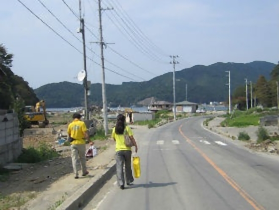 被災した子どもたちの調査のために訪ね歩くメンバー。最初に訪れた時と違い瓦礫の山がなくなり随分見違えました。