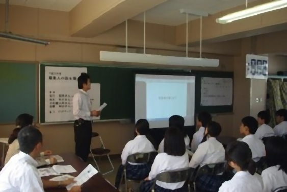 続いて、地元大手宅配便会社の支店長とセンター長が宅配便の仕事について語ってくれました。両名とも地元石巻の出身ということもあり、ジョークも交えながら生徒たちに情熱的に語っていました。どのようにして宅配便は届くのか、どのような人々が関わっているのか、楽しいことや苦しいことはなんなのかを話しました。宅配ドライバーが持っている情報入力の機器が車一台分に相当する価格であることなど、生徒たちは宅配便の裏話に興味を持ったようでした。