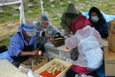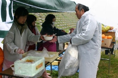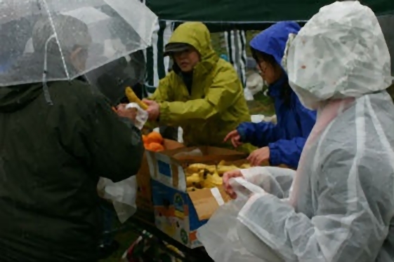 調理班の「こんな悪天候にもかかわらず来てくれた人達に、美味しい温かい食事を食べさせて上げたい」との必死の思いが伝わったのか、大雨の中、皆不満を漏らす事も無く静かにハヤシライスの出来上がりを待っていました。沢庵漬け、おにぎり、バナナ、ポンカン、コーヒー、お菓子も提供しました。