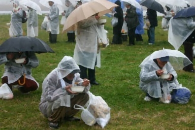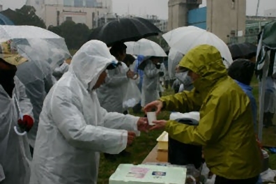 雨のため清掃は中止したのですが、真面目にゴミ拾いをしているホームレスの人がいました。この男性は、会場に来る途中もゴミ拾いをしながら来たのでした。長靴に大きな穴が開いていたので、靴を提供しようとしたのですが、要らないと頑なに固辞し、不思議な位控えめで礼儀正しい男性でした。