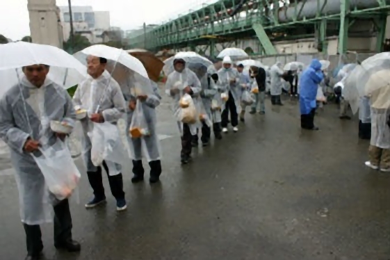 川崎市にて慈善活動ホームレス支援を行ないました。3月に続き、また雨の中での炊き出しとなりました。