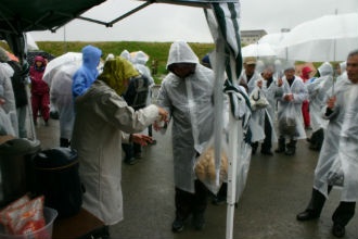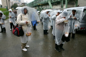 あるホームレスの男性の話では、雨のせいばかりではなく、年金が出たばかりで、今日は競輪・競馬も開催されていて、そちらに行ったのではということでした。逆にいえば、このような状況でもこの炊き出しを心待ちにしているホームレスの人達が64人もいるということでしょうか。