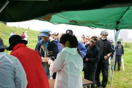 調理班の頑張りもあり11時30分頃から配食を開始出来ましたが、丁度その時が一番の本降りとなってしまい、皆、傘を差しての食事となってしまいました。しかし出来立ての熱々のカレーライスを皆、フーフー言いながら美味しそうに食べる姿には、ほっとするものがありました。