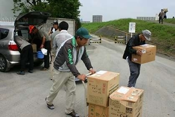 物品を積んだ車が到着するなりホームレスの人達が率先して会場まで運んでくれます。