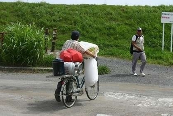 自転車に重たい荷物の運搬を手伝ってくれる男性ホームレス