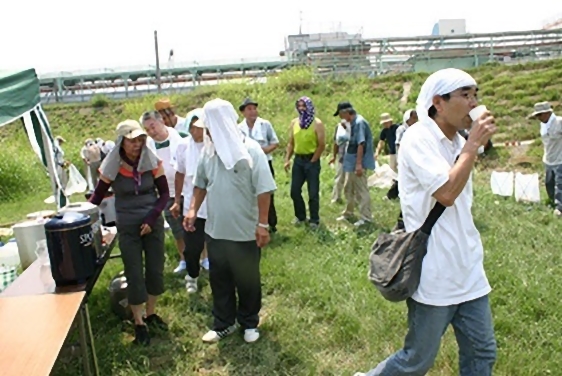 熱中症対策として、テントの設営、フェイスタオルの配布、冷たい飲み物は早くからいつでも飲めるように準備し、ホームレスの人達ばかりではなく、スタッフの人達も一緒に飲めるようにして、水分の補給を怠らないよう何度も注意を促し、対応致しました。
