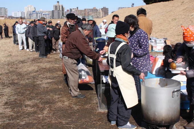 日差しが有難く、穏やか気候の中での炊き出しとなりました。新規参加者3名を含む73名の参加がありました。