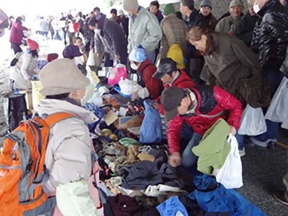 物品配布では、バナナ、乾パン、貼るカイロ3枚、提供頂いたレトルトカレーを、おにぎりと共にレジ袋に入れて手渡しました。スニーカー8足、革靴1足がありましたが、くじの順に並んだホームレスの人はまず靴から貰っていきました。毛布も5枚あって助かりました。