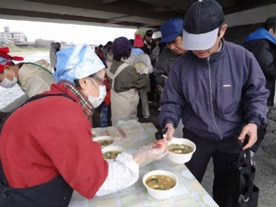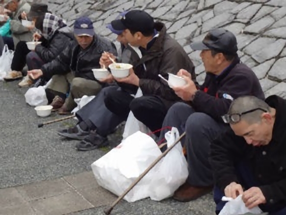この日のメニューは、具沢山味噌汁と、黒豆ご飯とゆかりご飯のおにぎり2個でした。具沢山味噌汁はその名の通り、根菜や葉物野菜、薄揚げなどが沢山入った味噌汁で食べ応えのあるものになりました。食事を終えたホームレスの人達は落ち着いた感じになっていました。