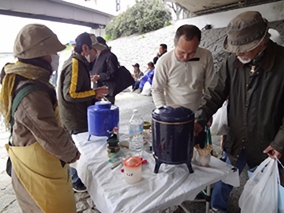 朝からよく晴れて日向では暑いくらいの晴天の中、初参加11名を含む103名のホームレスの人達が集まりました。 メニューは具沢山味噌汁で、その他、バナナ、乾パンなどをはじめ、アイスコーヒー、コーヒー、お茶、ビタミンC、衣類、日用品などを配布しました。