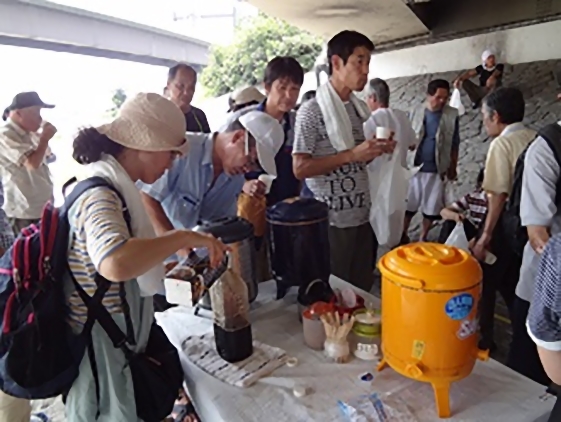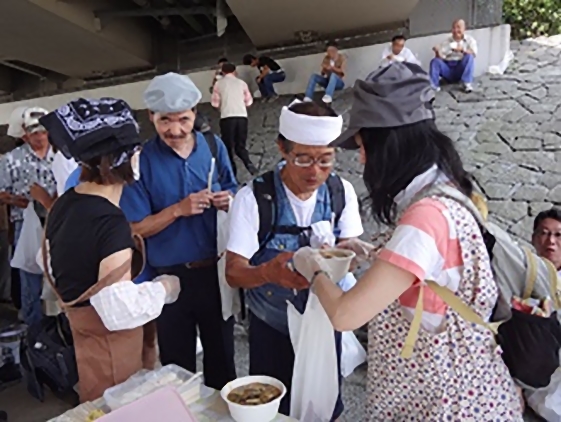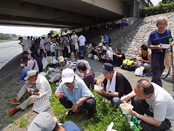 連日の猛暑が続く京都では、川べりの橋下とはいえ、通り抜ける風さえも生暖かく感じました。そのような中、3名の初参加者を含む86名のホームレスの人達が集まりました。