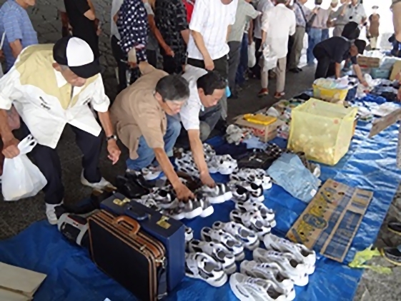 メニューは中華丼で、その他、バナナ、乾パン、パンなどをはじめ、アイスコーヒー、コーヒー、お茶、ビタミンC、衣類、スニーカー、日用品などを配布しました。熱中症予防のために、受付前から冷茶や冷水、スポーツドリンクを配りました。