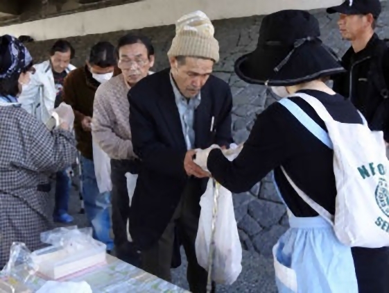 メニューは、具沢山味噌汁、おにぎり、バナナでした。陽だまりの中、温かい具沢山味噌汁は体の芯まで温まるようで好評でした。お代わりする人が多く、いつもより早くなくなりました。Tシャツ姿の男性に「寒くないの」と聞くと「味噌汁で体が温まったよ」と。別の男性は「味噌汁だけでお腹一杯になった」と嬉しそうでした。