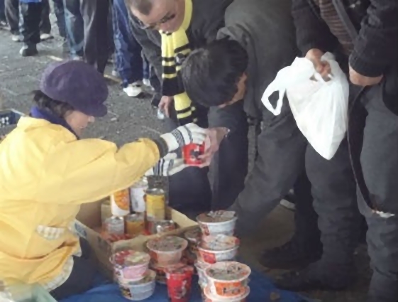 12月のメニューは「かき玉汁」とおにぎり、お汁粉、1月は「大根汁」とおにぎり、甘酒でした。配食前は冷え切った体を丸めるようにしていた人達も、温かい食事で漸く落ち着いた感じになりました。「ああ、美味しかった」と満足そうにつぶやく男性や「お袋を思い出す」と言う男性もいました。