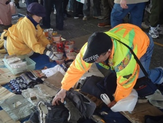 12月には、おにぎり、バナナ、乾パン、魚肉ソーセージ、ビタミンC、石鹸、タオル、カイロ3枚を全員に渡しました。ホームレスの人達は「こんなん貰えるの? 豪勢やなあ」と喜んでいました。その他に会員の方々からご寄付頂いた食品や衣類、靴、生活用品などを配布することが出来ました。