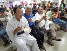 拍手で出迎えると、皆が楽しみにしている冷やしうどんの配食から始めました。「冷たくて美味しいわ」と思わず顔をほころばせる男性がいました。お代わりが相次ぎ、持ち帰り用のうどんセットも瞬く間になくなりました。